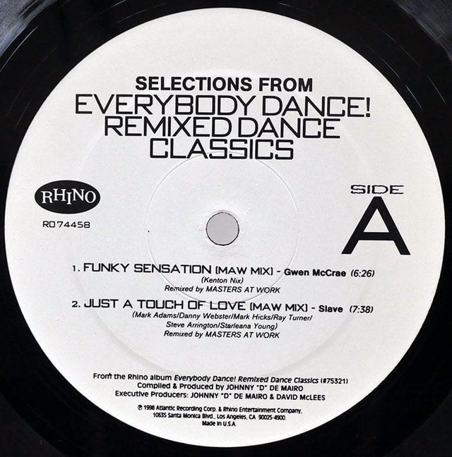 【Used】 アメリカの再発専科〈Rhino Entertainment〉による80年代ディスコクラシックスをアップデートすべく企画された『Everybody Dance! Remixed Dance Classics』からシングル・カット! ソング・リストを見てわかる通り、現在もトップDJ達がピーク・タイムにプレイするホンモノのクラシックスを、Masters At Work,Todd Terry,DJ Jazzy Jeff (A Touch Of Jazz Mix) らがリミックス。悪かろうはずがない完璧なメンツによる完璧なリミックス!特に「Funky Sensation」,「Good Times」は秀逸!聴けばわかります! A1. Gwen McCrae - Funky Sensation (MAW Mix) https://www.youtube.com/watch?v=doclWTTFEho A2. Slave - Just A Touch Of Love (MAW Mix) https://www.youtube.com/watch?v=Pbs7H-c3KM8 B1. Chic - Good Times (A Touch Of Jazz Mix) https://www.youtube.com/watch?v=1y29VVzrOe8 B2. The System - You Are In My System (Tee's Freeze Mix) https://www.youtube.com/watch?v=c-AsJKlCXHc B3. Linda Clifford - Runaway Love (MAW Mix) https://www.youtube.com/watch?v=LbHrn1xb75Q