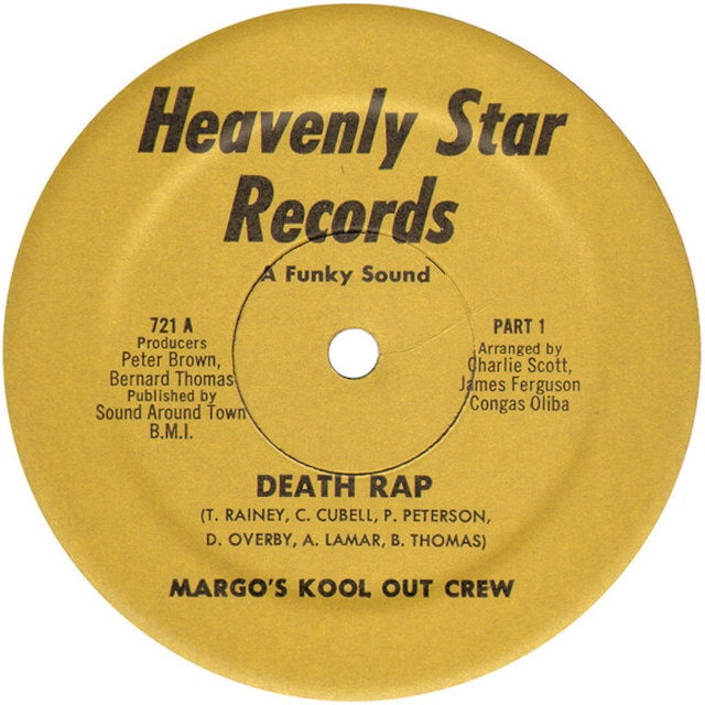 【Used,Reissue】 カルト・ディスコ専科〈P&P〉でお馴染みの名プロデューサー、Peter Browによるこれまたカルデ・ディスコ専科〈Heavenly Star Records〉に残されたレア・ディスコ・ラップ・シングル!オリジナル盤はウルトラ・レア! 現場感たっぷりなオープニング、ドラム・ブレイクで始まる。うねる極太いベース・ライン、カッティング・ギター、コズミックなシンセ・サウンド。そこへ5MC’sによるマイク・リレーとコーラスにガヤが乗る、これぞオールドスクール・ラップ!な人力ファンキー・ディスコ・ラップ・チューン。P&R関連のコンピレーションには必ず選曲されるDJフレンドリーな人気曲。 DJ Harvey, Crispin Glover, Norman Jay, Ross Allen and Kenny Dope,ECD,Muro,KZAらもプレイ! A.Death Rap (Part 1) https://www.youtube.com/watch?v=dHOGV1u6MMw B.Death Rap (Part 2)