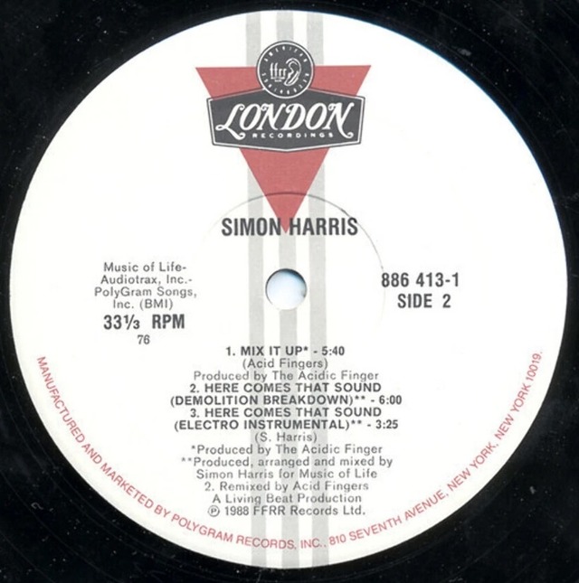 【Used】 サイモン・ハリスは、70年代後半からDJをスタート。80年代に入りリミックス・チームを結成、ブリット・ファンクのザ・リアル・シングス「You To Me Are Everything」のリミックスを手掛け全英シングル・チャート5位の大ヒットを記録。その後、自身のレーベル〈Music Of Life〉を立ち上げクラブDJのためのDJツールや、英国ヒップホップ・アーティストを積極的に紹介していった。 また自身の作品も積極的にリリース。88年に、メジャー・レーベル〈FFRR〉からリリースしたファースト・シングル「BASS」が大ヒット!続く、セカンド・シングルがこれだ。 87年にM/A/R/R/Sが「パンプ・アップ・ザ・ヴォリューム」で世界的ヒットを飛ばした翌年のリリース。時代的にカットアップ〜エディットで制作されたメガミックス・スタイルによるDJミュージックだ。聴いてもらえればわかります。B面にはヒップ・ハウス・チューンのアシッド・ハウス・リミックスも収録!BDPやアイスTなどヒップホップ・クラシックスのラップ・フレーズが随所に盛り込まれる面白い仕上がり。 A1Here Comes That Sound (Perfect Beat Mix) https://www.youtube.com/watch?v=Z36P6IrOcPg&t=374s A2Here Comes That Sound (Acid Fingers Breakdown) Remix – Acid Fingers https://www.youtube.com/watch?v=Edrth4YoPbM B1Only A Demo (Acid Fingers Rap Session) https://www.youtube.com/watch?v=ypJm6QVdvOQ B2Only A Demo (Acid Fingers Instrumental) Remix – Acid Fingers