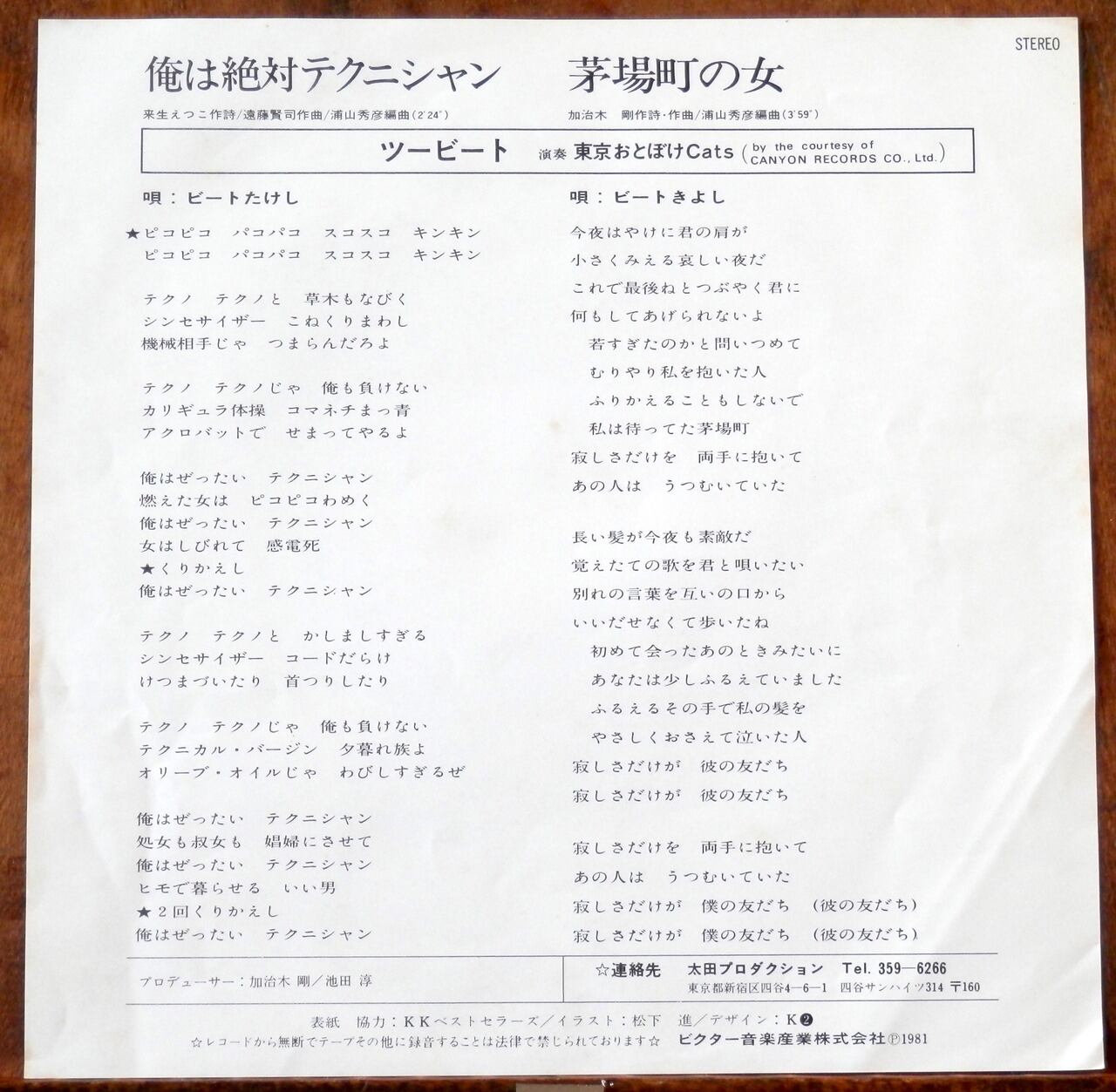 81年リリース、作詞:来生えつこ, 作曲:遠藤賢司, 編曲:浦山秀彦に演奏が東京おとぼけCatsというホンイキの布陣が、当時YMOらにより盛り上がっていたテクノ歌謡をビートたけしに揶揄させたような企画。