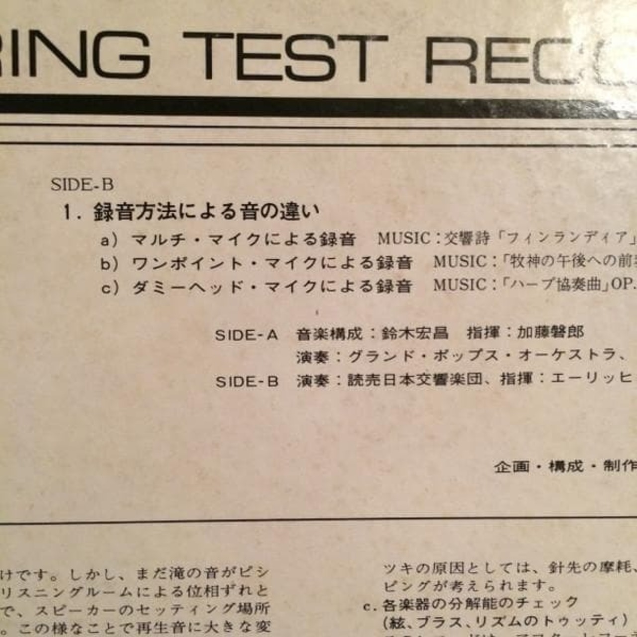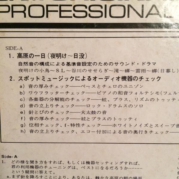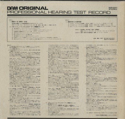 自然音による基準音設定、スポット・ミュージックによる機器のバランスのチェックというDAMらしい、感性に訴えるオーディオ・チェック・レコード。B面は録音方法(マイク)による音の違いを体感出来ます。